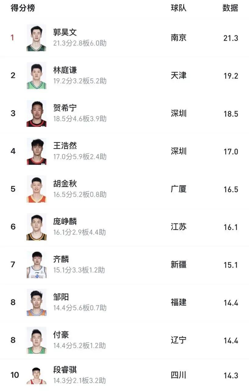 专业体育直播-连克北京上海,国内球员得分榜前五占俩,贺希宁王浩然太猛了